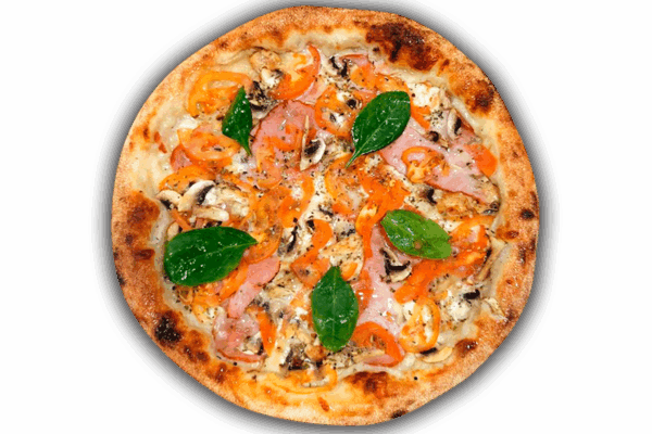 Склад: Моцарелла, вершковий соус, шинка, балик, курочка гриль, печериці, томати