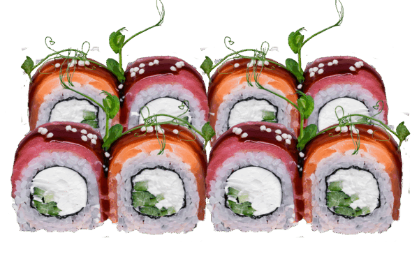 Рол 1 для сету БДСМРол з філе лосося, тунця та рисовими кульками Склад: рис, норі, крем-сир, огірок, філе лосося, філе тунця, соус унагі, рисові кульки, мікрогрін