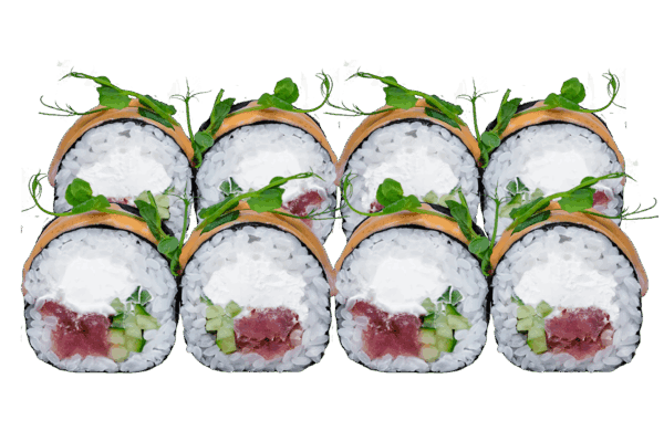 Склад: рис, норі, крем-сир, гарбуз кампіо, лосось холодного копчення, білий кунжут, соус унагі