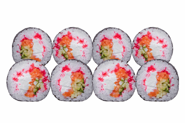 Склад: рис, норі, крем-сир, червона ікра масаго, лосось холодного копчення, огірок.