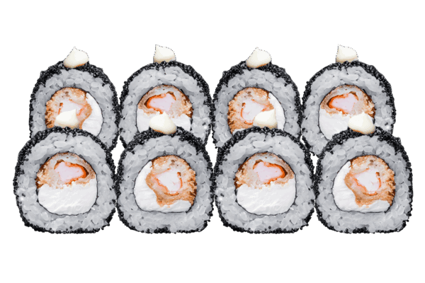 Рол 4 для сету ДіджиталізейшнРол з креветочкою у темпурі та ікрою масаго Склад: рис, норі, крем-сир, креветка в темпурі, чорна ікра масаго, японський майонез.