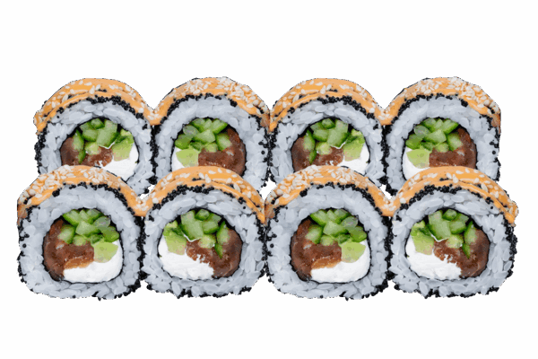 Рол 4 для сету Хера СєРол з маринованим лососем та авокадо Склад: рис, норі, крем-сир, маринований лосось, авокадо, чорна ікра масаго, соус спайсі, білий кунжут