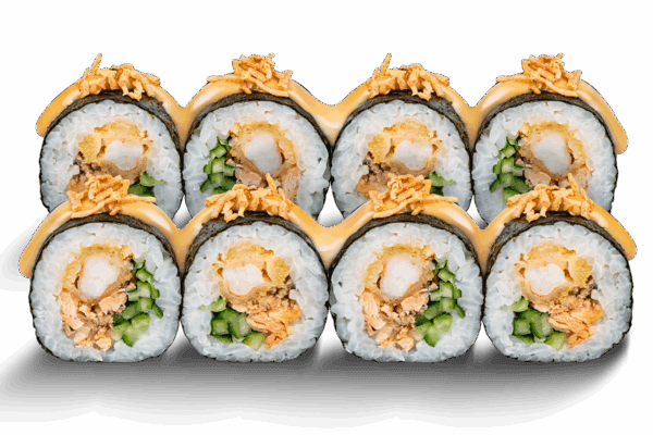 Склад: рис, норі, креветка в темпурі, японський омлет, запечений лосось, огірок, фірмовий соус, криспі краб