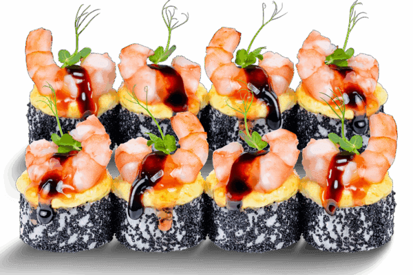 Рол з сирною шапкою та креветкою зверху