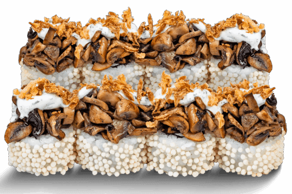 Склад: рис, норі, коровяча бринза, болгарський перець, рисові кульки, смажені гриби, соус сметанний з часником та зеленню, криспі цибуля, мікрогрін