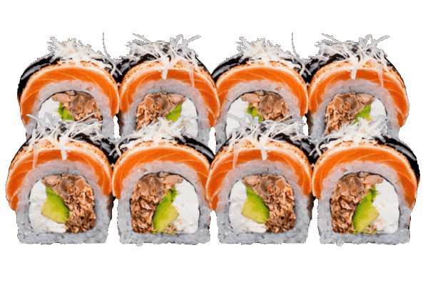 Склад: рис, норі, крем-сир, запечений лосось, авокадо, філе лосося, соус унагі, сир пармезан