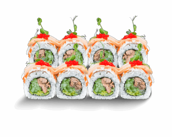 Склад: рис, норі, крем-сир, огірок, тигрова креветка, лосось філе, соус спайсі, соус унагі