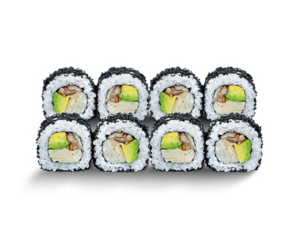 Склад: рис, норі, крем-сир, огірок, авокадо, вугор, соус унагі, кунжут