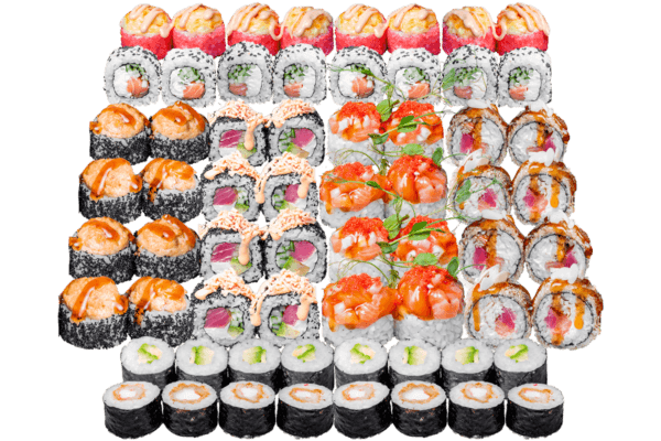 Склад: Рис, норі, крем-сир, маринований лосось, маринований тунець, вугор, соус унагі, слайси мигдалю